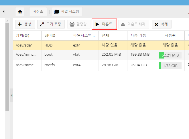 파티션 생성이 완료되었다면 마운트 버튼을 눌러서 마운트 시켜줍니다. 마운트 이후 상단에 노란색 경고창이 뜰 수 있습니다. [적용]버튼을 눌러주어야 정삭적으로 적용됩니다.