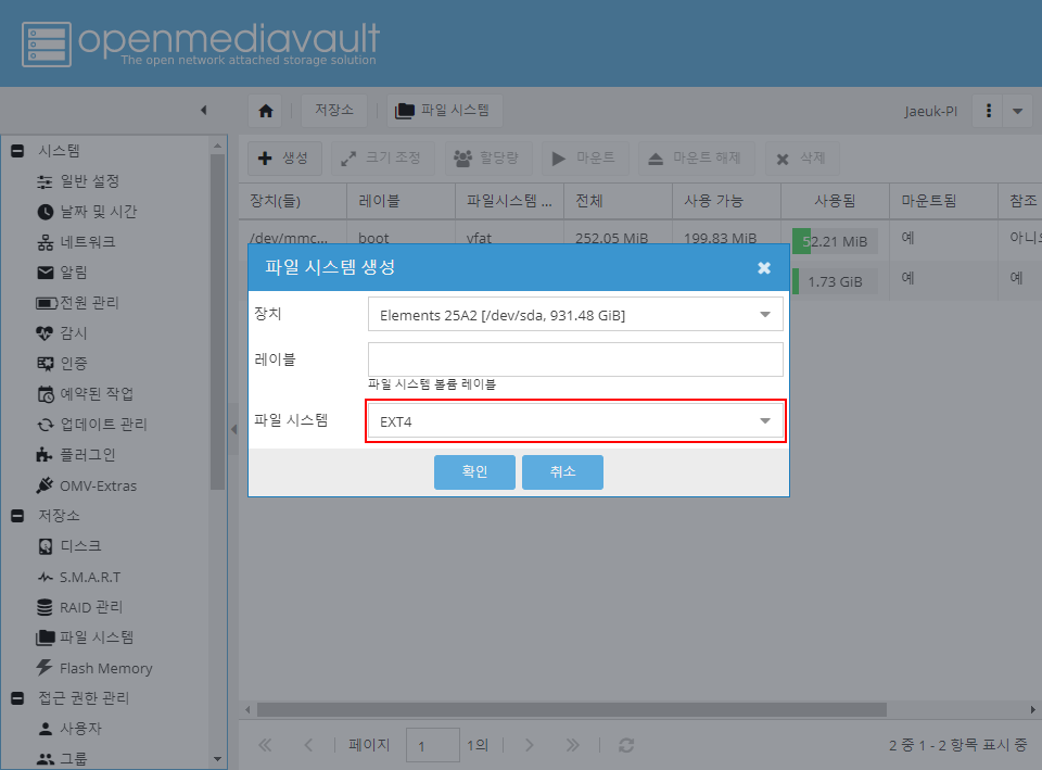 이때 HDD의 파티션이 ext4로 포멧되어 있지 않다면 리눅스(라즈비안)에서 폴더별 권한 설정을 할 수 없기 때문에 NextCloud 등을 사용할 때 에러가 발생하게 됩니다. 그래서 리눅스에서 사용하는 ext4로 포멧해 주어야 합니다.